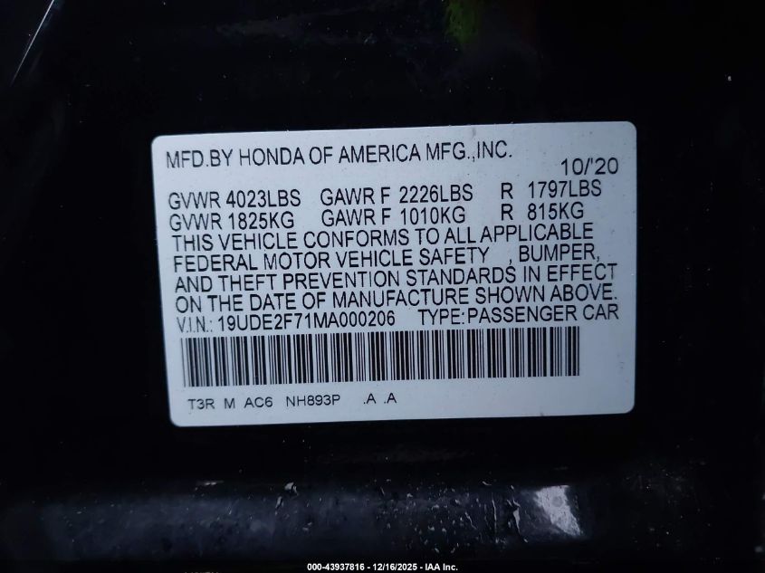 2021 ACURA ILX - 19UDE2F71MA000206, колір - Чорний, 2.4, Бензин, Передній привід із США