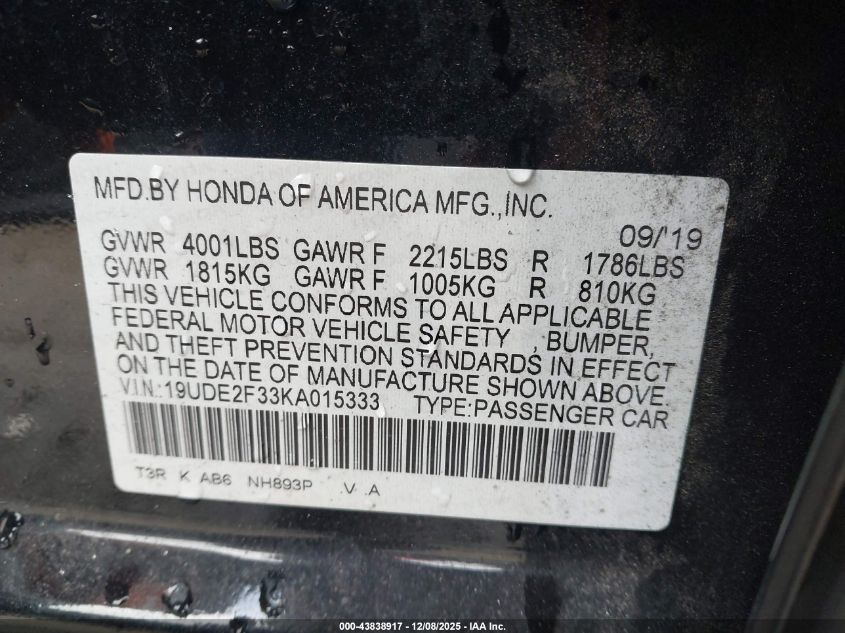 2019 ACURA ILX - 19UDE2F33KA015333, колір - Чорний, 2.4, Бензин, Передній привід із США
