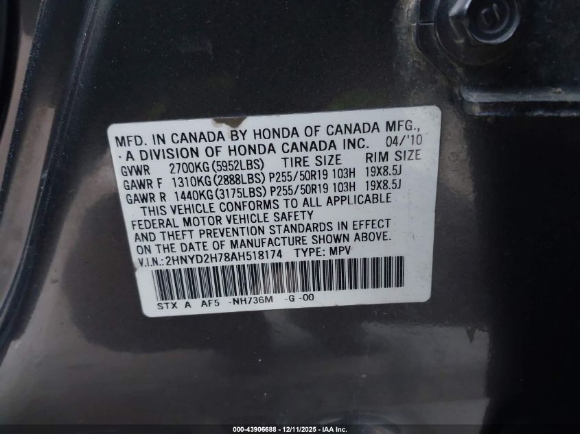 Колір СірийЦиліндри 6Привід Повний привідVIN 2HNYD2H78AH518174Стан Заводиться та їде (перевірено)Ушкодження Передня або задня