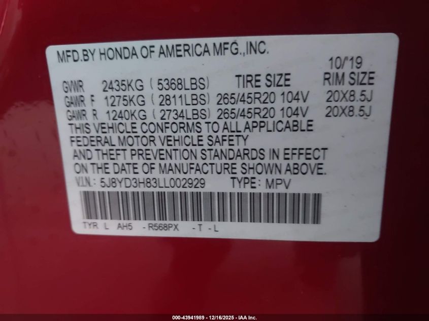 2020 ACURA MDX - 5J8YD3H83LL002929, колір - Червоний, 3.5, Бензин, Передній привід із США