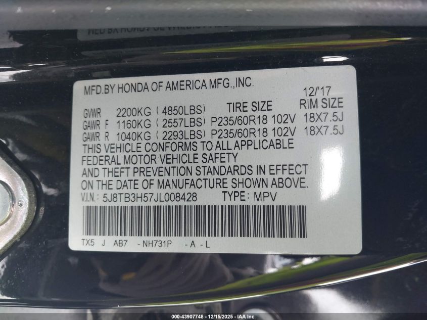2018 ACURA RDX - 5J8TB3H57JL008428, колір - Чорний, 3.5, Бензин, Передній привід із США