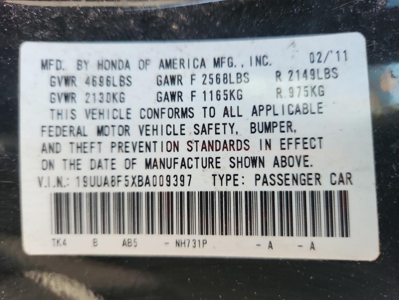 Колір ЧорнийЦиліндри 6VIN 19UUA8F5XBA009397Стан Заводиться та їде (перевірено)Ушкодження Передня або задняДата аукціона 2025-10-07