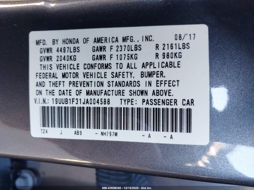2018 ACURA TLX - 19UUB1F31JA004588, колір - Сірий, 2.4, Бензин, Передній привід із США