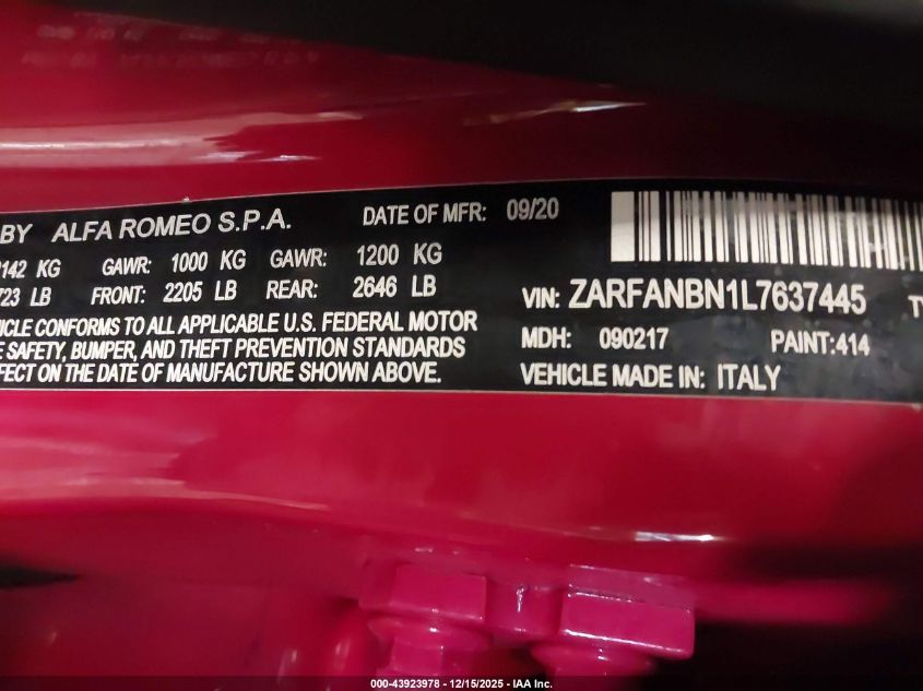 2020 ALFA ROMEO GIULIA - ZARFANBN1L7637445, колір - , 2.0, Бензин, Повний привід із США
