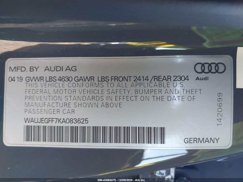 2019 AUDI A3 - WAUJEGFF7KA083625, колір - Сірий, 2.0, Бензин, Повний привід із США