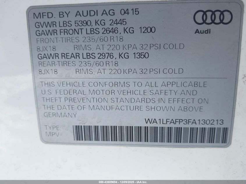 2015 AUDI Q5 - WA1LFAFP3FA130213, колір - Білий, 2.0, Бензин, Повний привід із США