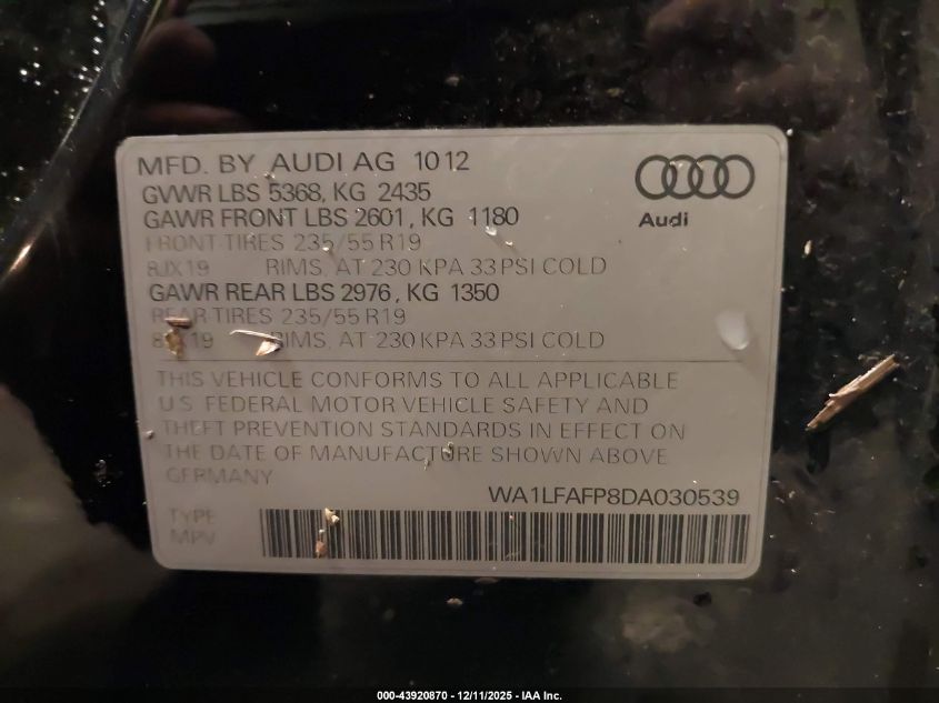 Колір ЧорнийЦиліндри 4Привід Повний привідVIN WA1LFAFP8DA030539Стан СтаціонарноУшкодження Вода