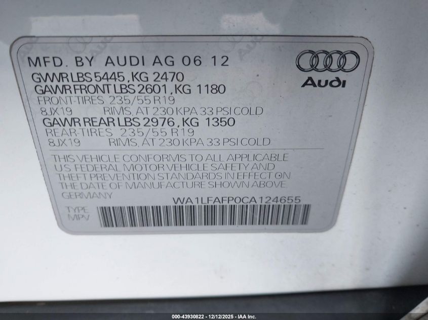 2012 AUDI Q5 - WA1LFAFP0CA124655, колір - Білий, 2.0, Бензин, Повний привід із США