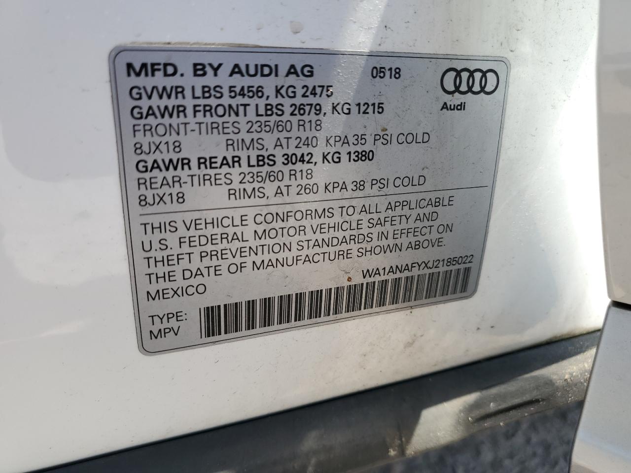 2018 AUDI Q5 - WA1ANAFYXJ2185022, колір - Білий, 2.0, Бензин, Повний привід із США