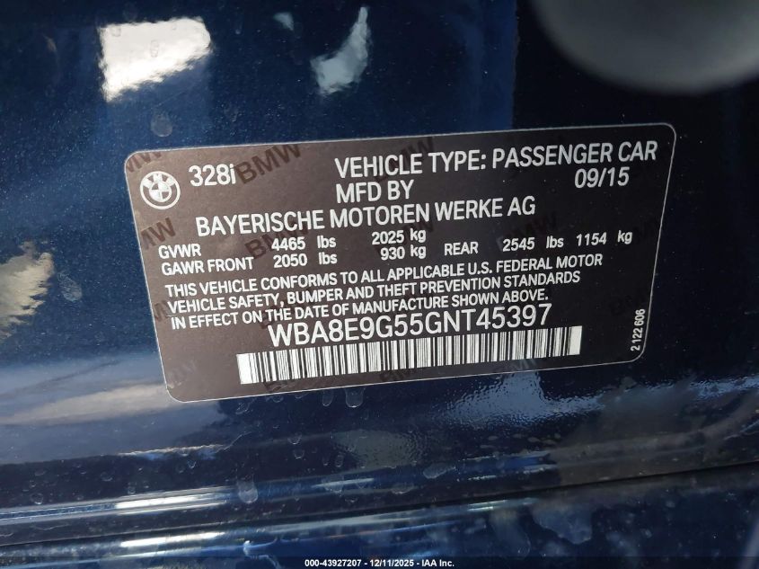 2016 BMW 3 SERIES - WBA8E9G55GNT45397, колір - Мілітарі, 2.0, Бензин, Задній привід із США