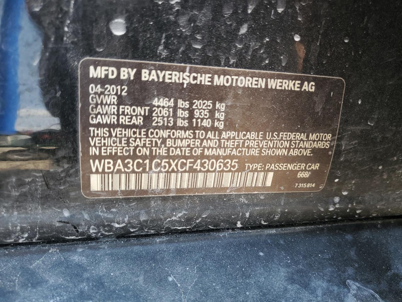 2012 BMW 3 SERIES - WBA3C1C5XCF430635, колір - Чорний, 2.0, Бензин, Задній привід із США