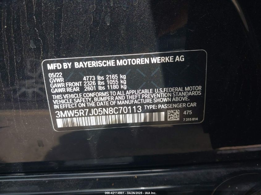 2022 BMW 3 SERIES - 3MW5R7J05N8C70113, колір - Чорний, 2.0, Бензин, Повний привід із США
