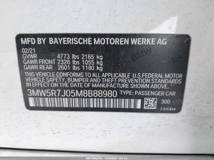 2021 BMW 3 SERIES - 3MW5R7J05M8B88980, колір - Білий, 2.0, Бензин, Повний привід із США