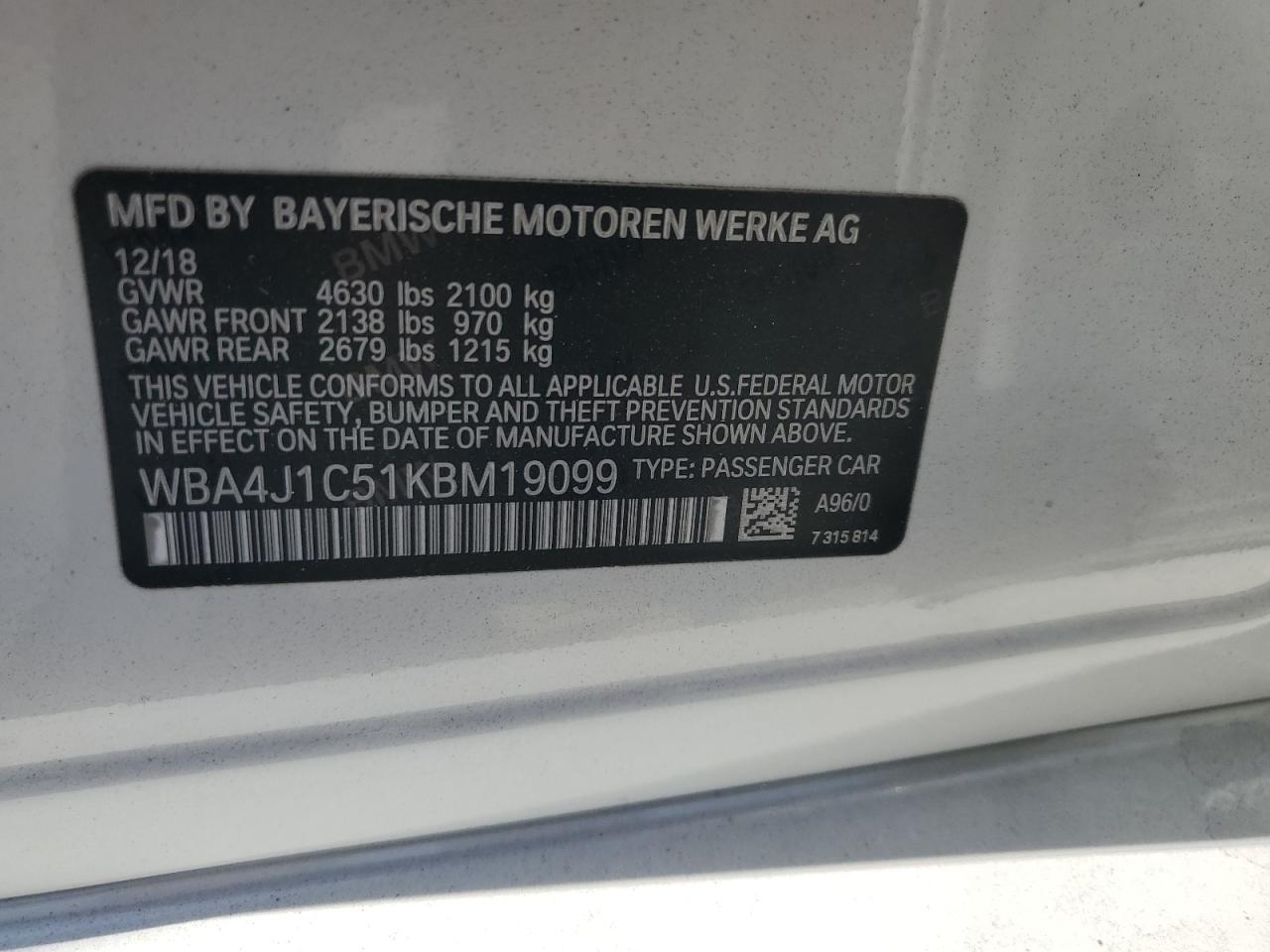 2019 BMW 4 SERIES GRAN COUPE - WBA4J1C51KBM19099, колір - Білий, 2.0, Бензин, Задній привід із США