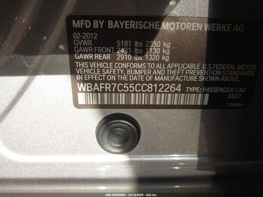 2012 BMW 5 SERIES - WBAFR7C55CC812264, колір - , 3.0, Бензин, Задній привід із США