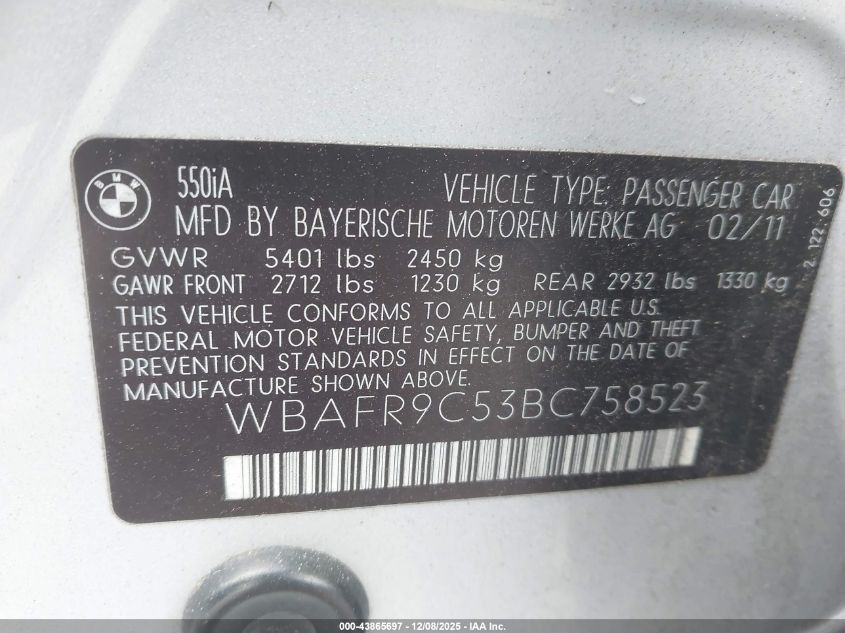 2011 BMW 5 SERIES - WBAFR9C53BC758523, колір - Срібний, 4.4, Бензин, Задній привід із США