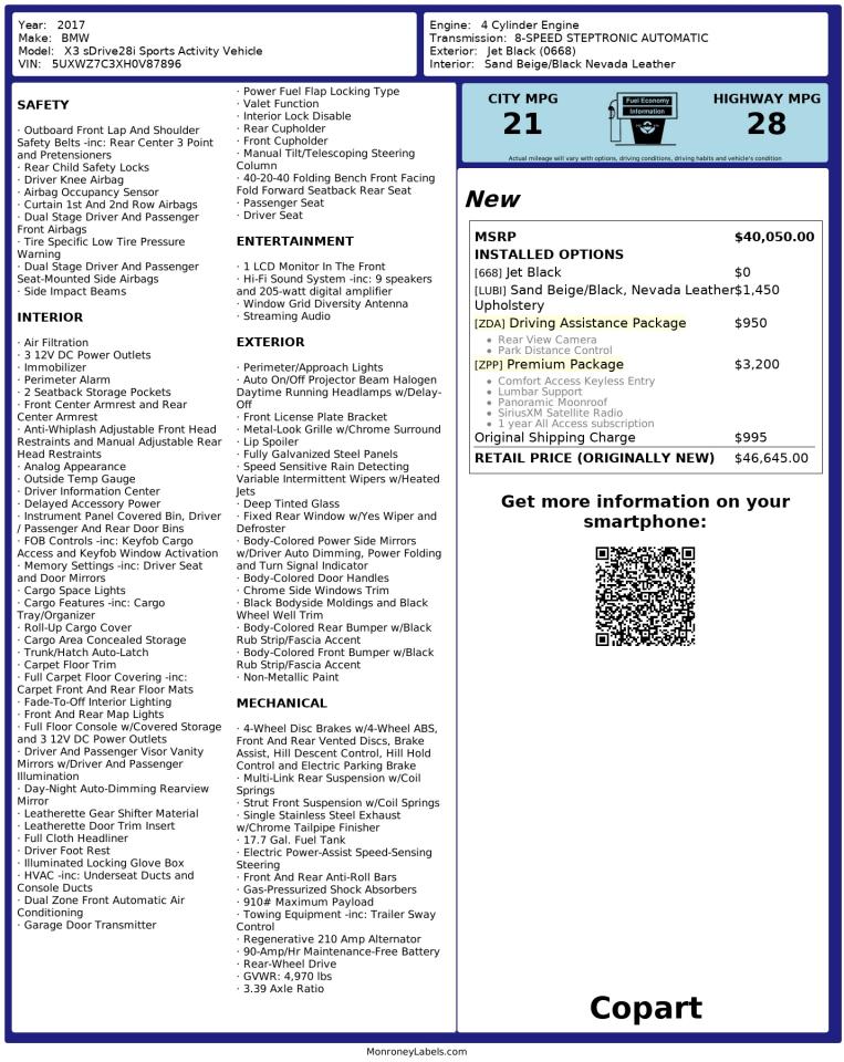 2017 BMW X3 - 5UXWZ7C3XH0V87896, колір - Чорний, 2.0, Бензин, Задній привід із США