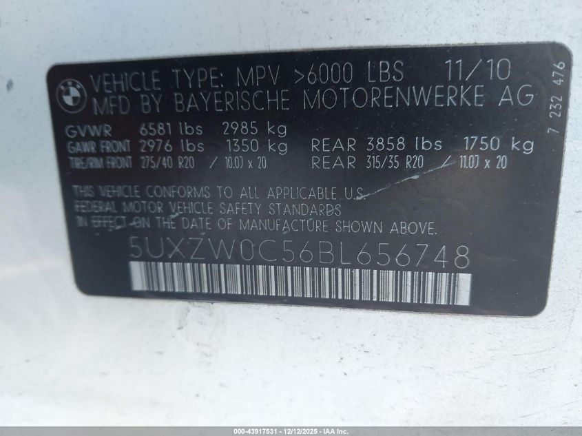 Колір БілийЦиліндри 6Привід Повний привідVIN 5UXZW0C56BL656748Стан Заводиться та їде (перевірено)Ушкодження Передня і задня