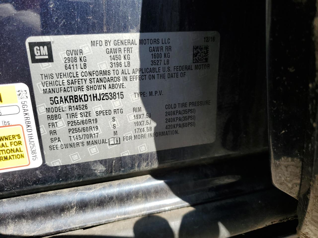 Колір СинійЦиліндри 6VIN 5GAKRBKD1HJ253815Стан НевідомоУшкодження НезначніДата аукціона 2025-10-13