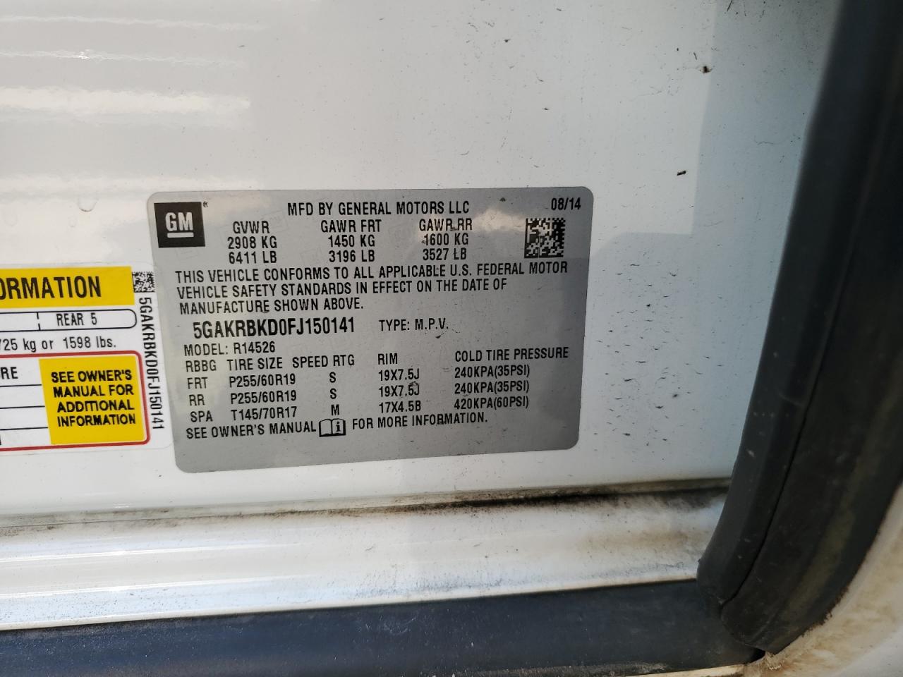 Колір БілийЦиліндри 6VIN 5GAKRBKD0FJ150141Стан Заводиться та їде (перевірено)Ушкодження Передня або задняДата аукціона 2025-10-21