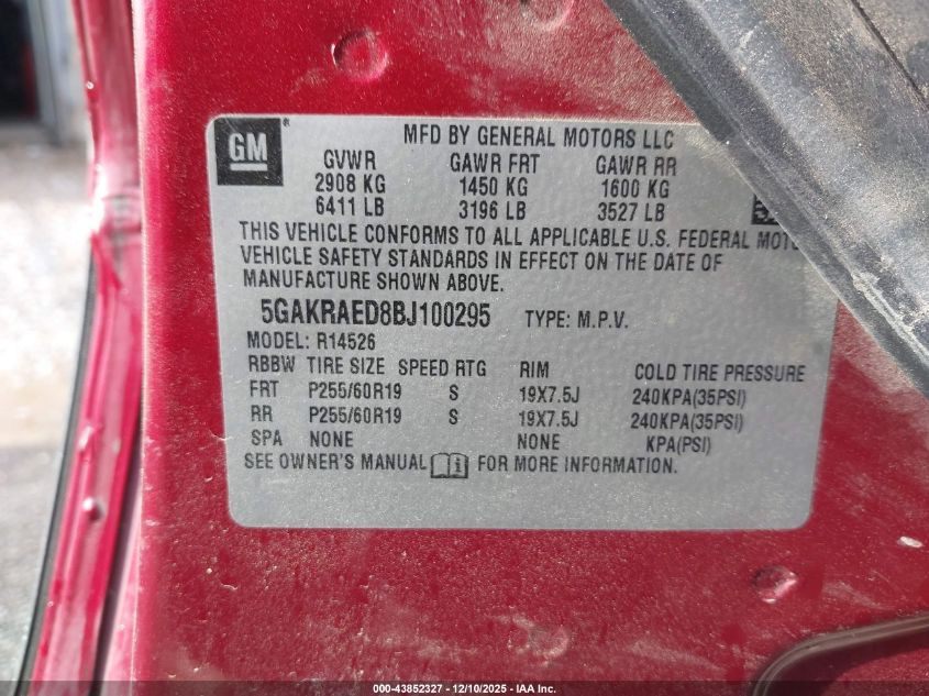 Колір БургундіяЦиліндри 6Привід Передній привідVIN 5GAKRAED8BJ100295Стан Заводиться та їде (перевірено)Ушкодження Звичайний зносДата аукціона 2025-12-18