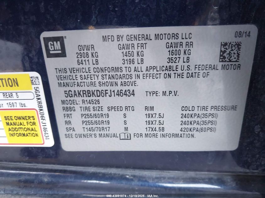 Колір СинійЦиліндри 6Привід Передній привідVIN 5GAKRBKD6FJ146434Стан Заводиться та їде (перевірено)Ушкодження Передня або задня