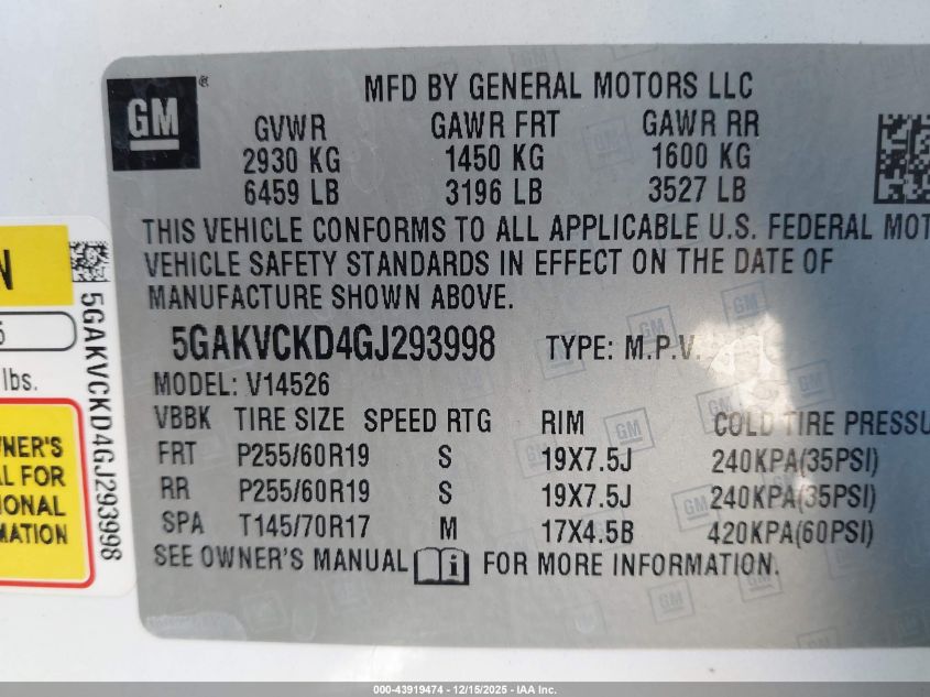 Колір БілийЦиліндри 6Привід Повний привідVIN 5GAKVCKD4GJ293998Стан Заводиться та їде (перевірено)Ушкодження Передня або задня