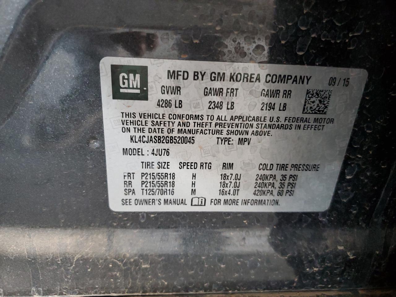 Колір СірийЦиліндри 4VIN KL4CJASB2GB520045Стан Заводиться та їде (перевірено)Ушкодження НезначніДата аукціона 2025-10-08
