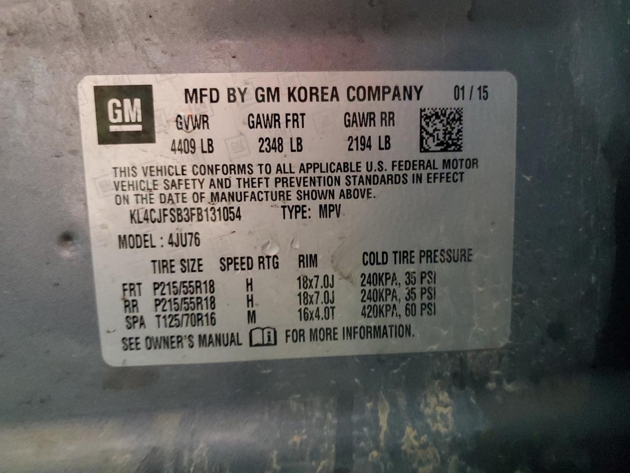 Колір СрібнийЦиліндри 4Привід Повний привідVIN KL4CJFSB3FB131054Стан Заводиться та їде (перевірено)Ушкодження Передня або задняДата аукціона 2025-10-07