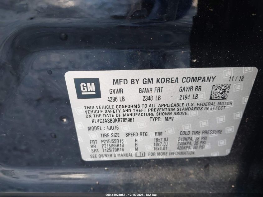 Колір Циліндри 4Привід Передній привідVIN KL4CJASB0KB785961Стан НевідомоУшкодження Перекидання