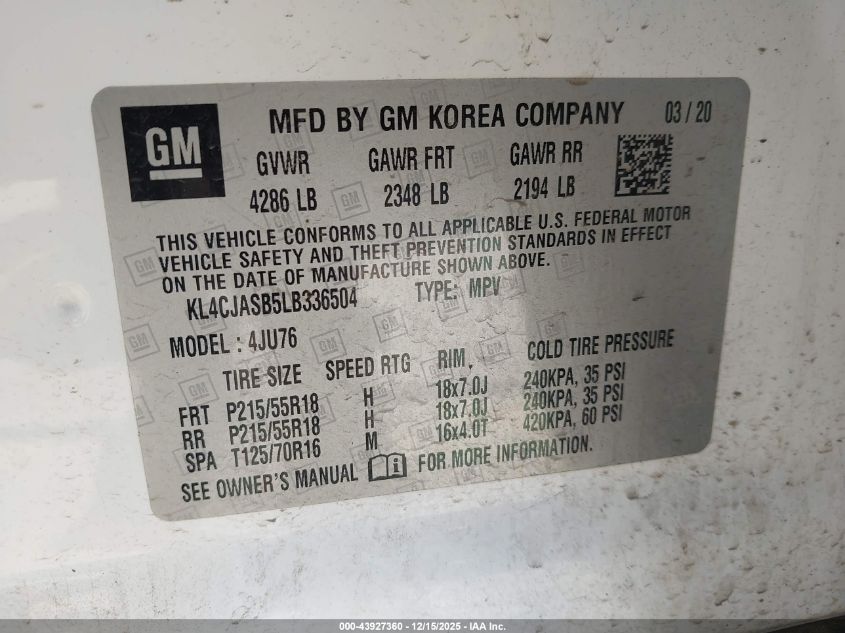 2020 BUICK ENCORE - KL4CJASB5LB336504, колір - Білий, 1.4, Бензин, Передній привід із США
