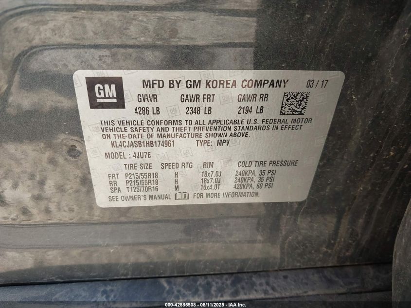 Колір ЧорнийЦиліндри 4Привід Передній привідVIN KL4CJASB1HB174961Стан СтаціонарноУшкодження По всьому авто