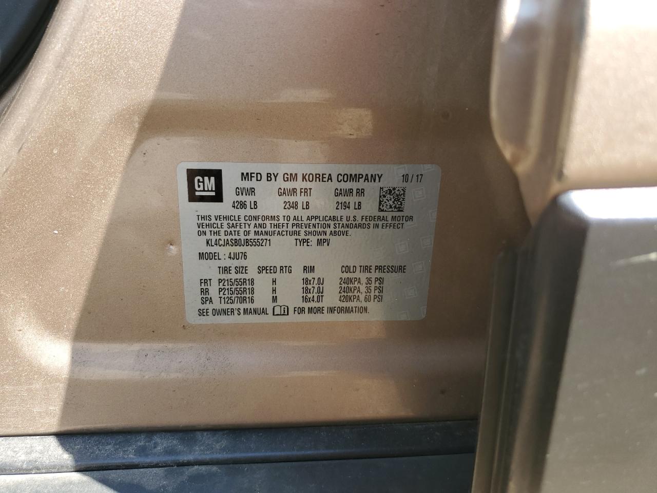 Колір КоричневийЦиліндри 4VIN KL4CJASB0JB555271Стан Заводиться та їде (перевірено)Ушкодження ВандалізмДата аукціона 2025-10-10