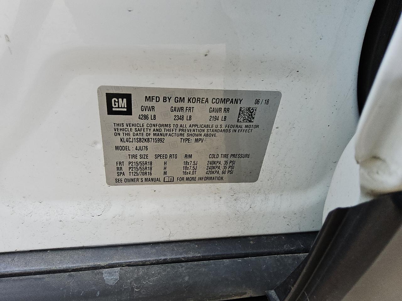 Колір БілийЦиліндри 4VIN KL4CJ1SB2KB715992Стан Заводиться та їде (перевірено)Ушкодження НезначніДата аукціона 2025-10-07