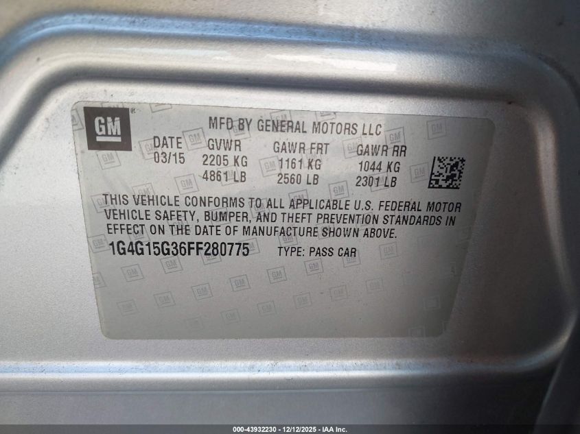 2015 BUICK LACROSSE - 1G4G15G36FF280775, колір - Срібний, 3.6, Бензин, Передній привід із США