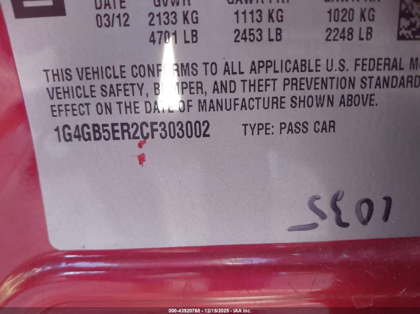 Колір Циліндри 4Привід Передній привідVIN 1G4GB5ER2CF303002Стан НевідомоУшкодження Звичайний знос
