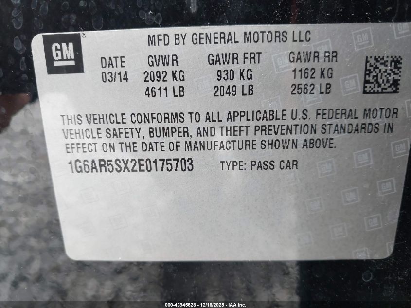 Колір ЧорнийЦиліндри 4Привід Задній привідVIN 1G6AR5SX2E0175703Стан НевідомоУшкодження Звичайний знос