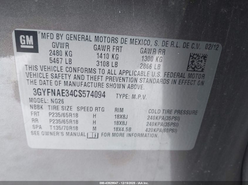 Колір КоричневийЦиліндри 6Привід Передній привідVIN 3GYFNAE34CS574094Стан СтаціонарноУшкодження Пожежа