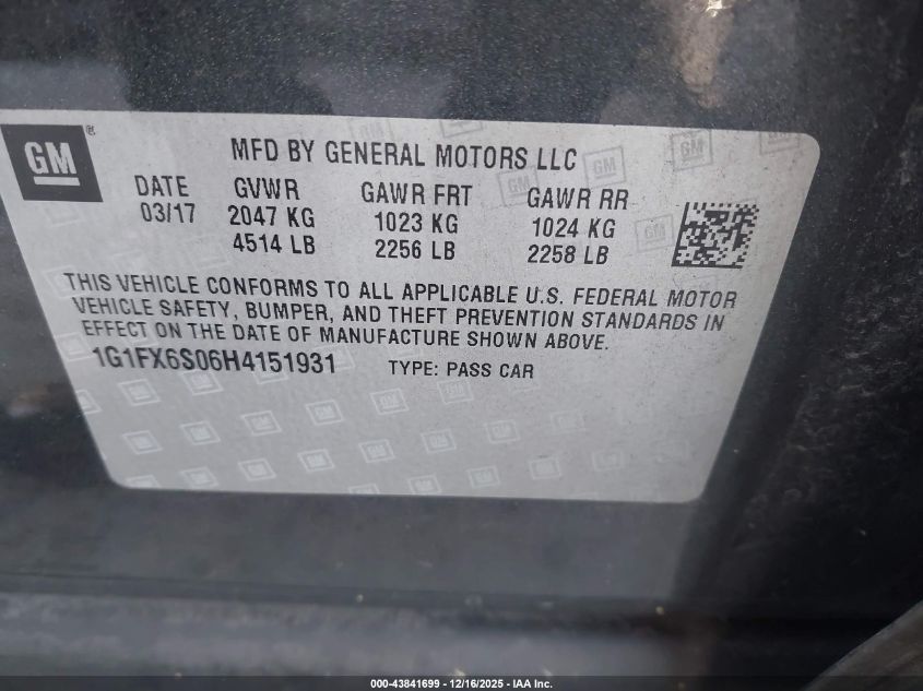 Колір Привід Передній привідVIN 1G1FX6S06H4151931Стан НевідомоУшкодження Передня ліва