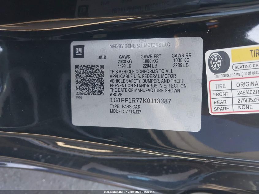 2019 CHEVROLET CAMARO - 1G1FF1R77K0113387, колір - Чорний, 6.2, Бензин, Задній привід із США