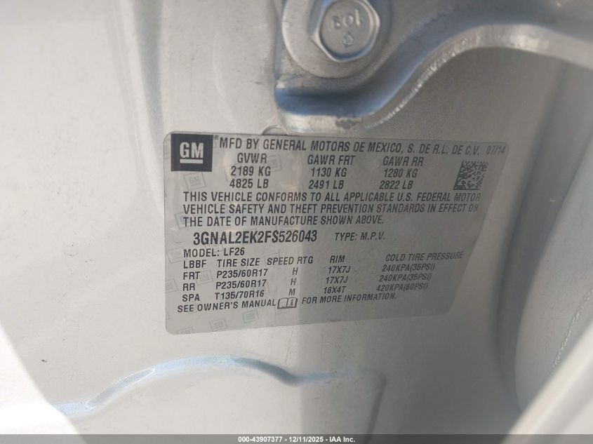 2015 CHEVROLET CAPTIVA - 3GNAL2EK2FS526043, колір - Срібний, 2.4, Бензин, Передній привід із США