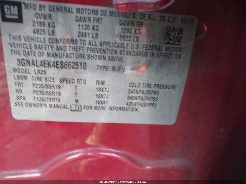 Колір ЧервонийЦиліндри 4Привід Передній привідVIN 3GNAL4EK4ES662510Стан СтаціонарноУшкодження Пожежа двигуна