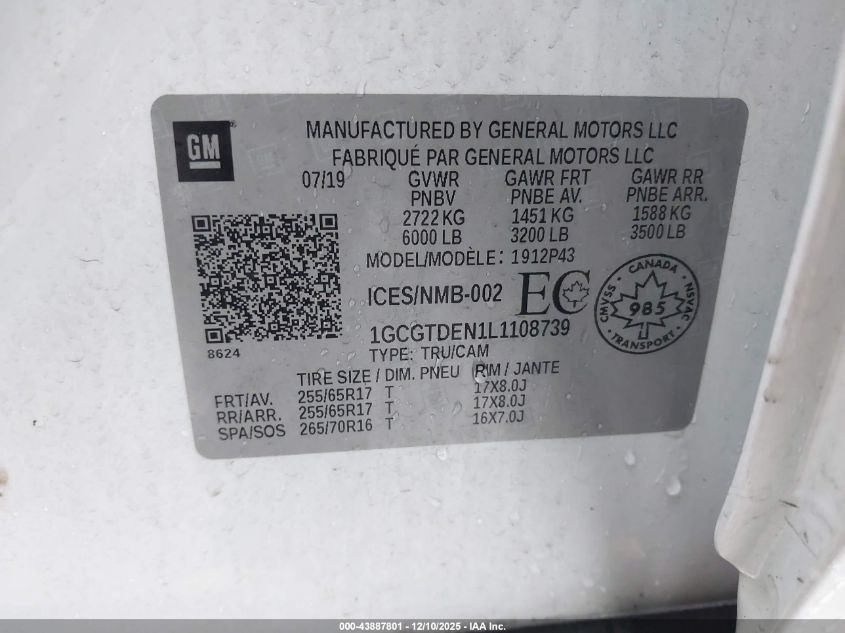 2020 CHEVROLET COLORADO - 1GCGTDEN1L1108739, колір - Білий, 3.6, Бензин, Повний привід із США