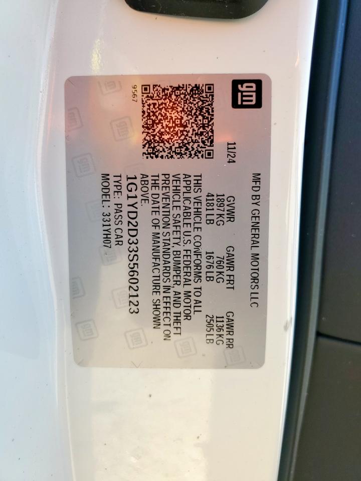 2025 CHEVROLET CORVETTE - 1G1YD2D33S5602123, колір - Білий, 5.5, Бензин, Задній привід із США