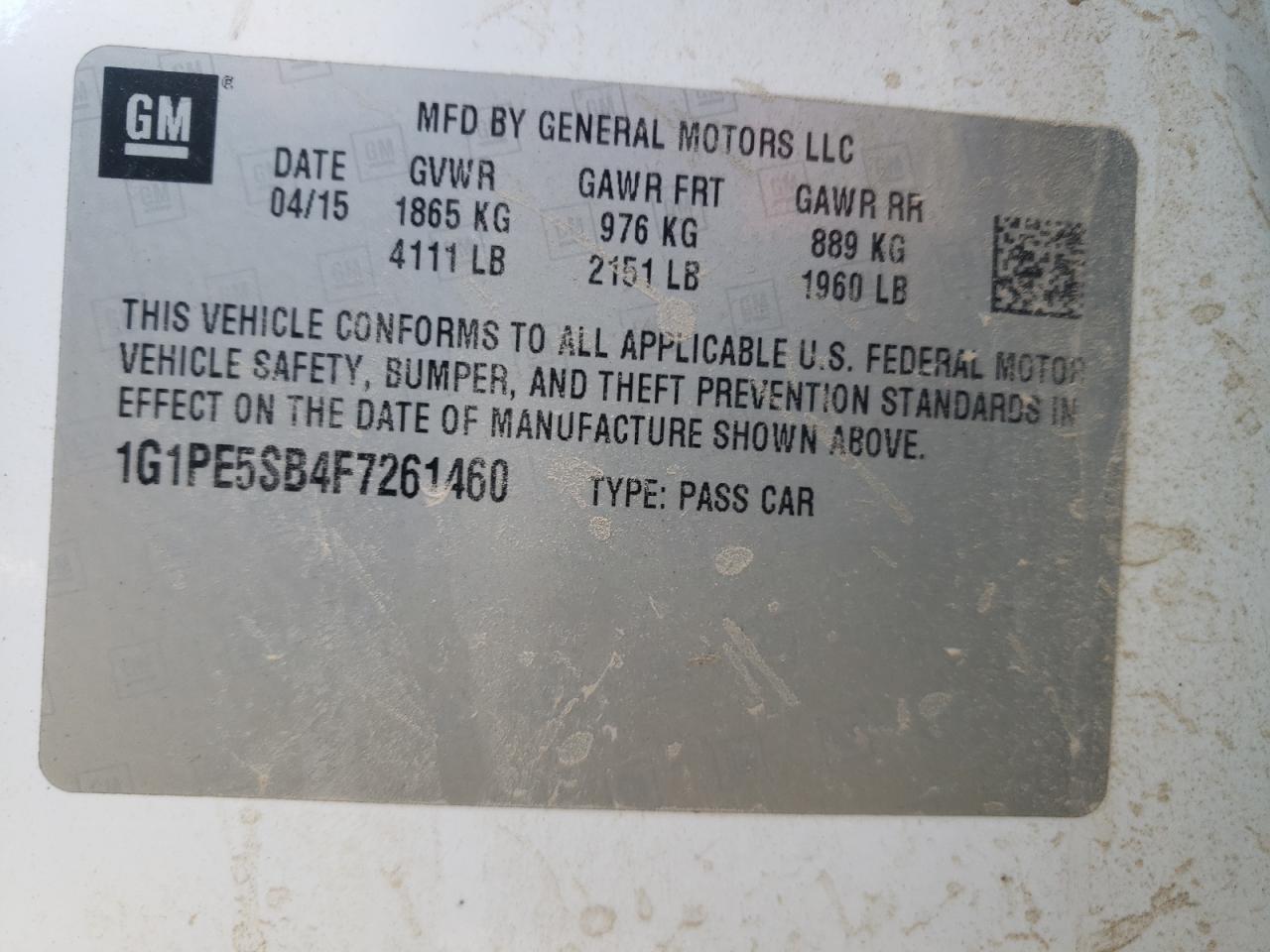 Колір БілийЦиліндри 4VIN 1G1PE5SB4F7261460Стан НевідомоУшкодження Передня або задня