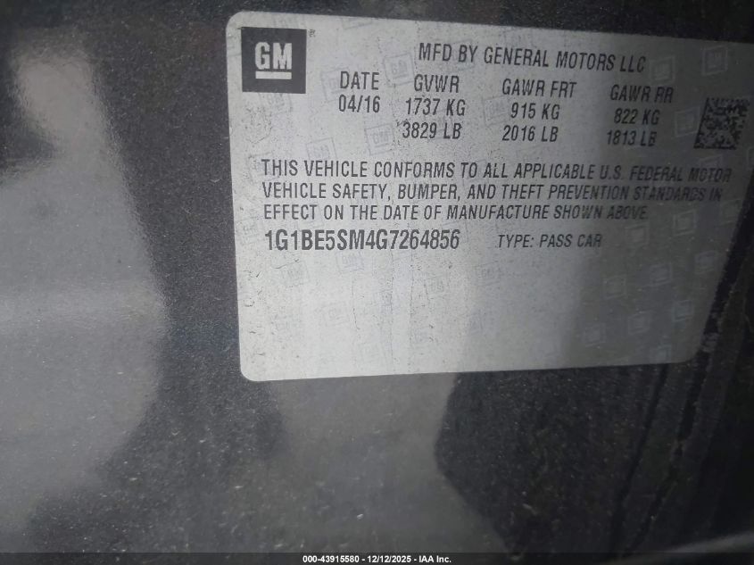 Колір СірийЦиліндри 4Привід Передній привідVIN 1G1BE5SM4G7264856Стан Заводиться та їде (перевірено)Ушкодження Передня права