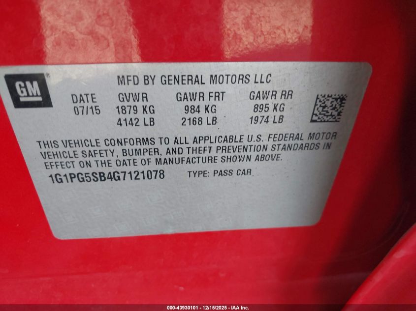 Колір ЧервонийЦиліндри 4Привід Передній привідVIN 1G1PG5SB4G7121078Стан СтаціонарноУшкодження Пожежа двигуна