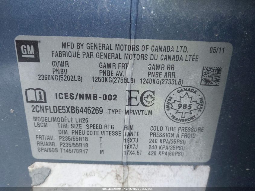 2011 CHEVROLET EQUINOX - 2CNFLDE5XB6446269, колір - Мілітарі, 3.0, Бензин, Передній привід із США