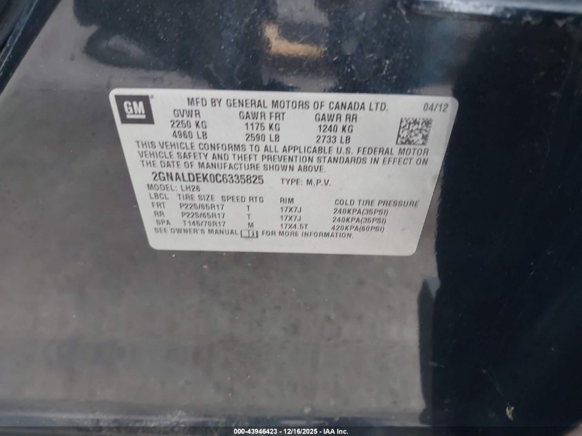 Колір ЧорнийЦиліндри 4Привід Передній привідVIN 2GNALDEK0C6335825Стан СтаціонарноУшкодження Задня права