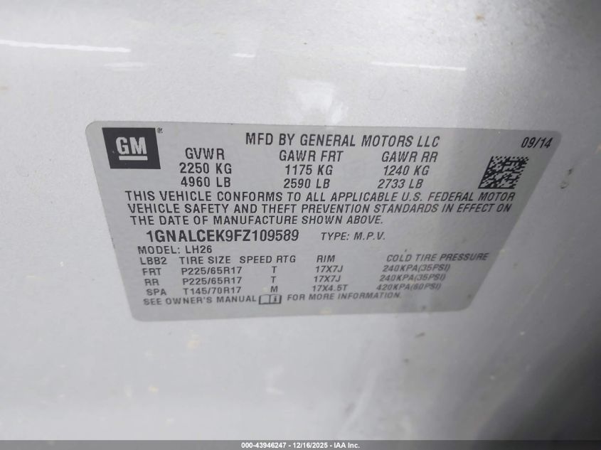 2015 CHEVROLET EQUINOX - 1GNALCEK9FZ109589, колір - Срібний, 2.4, Бензин, Передній привід із США